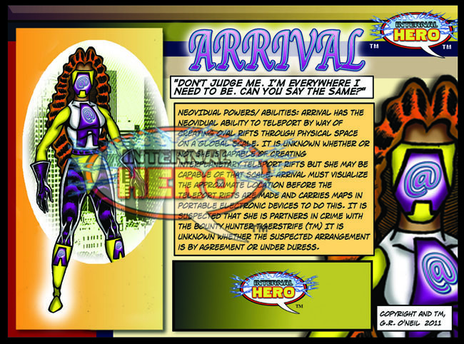 Neovidual Powers/ abilities: Arrival has the neovidual ability to teleport by way of creating oval rifts through physical space on a global scale. It is unknown whether or not she is capable of creating interplanetary teleport rifts but she may be capable of that scale. Arrival must visualize the approximate location before the teleport rifts are made and carries maps in portable electronic devices to do this. It is suspected that she is partners in crime with the bounty hunter Tigerstrife. It is unknown whether the suspected arrangement is by agreement or under duress.