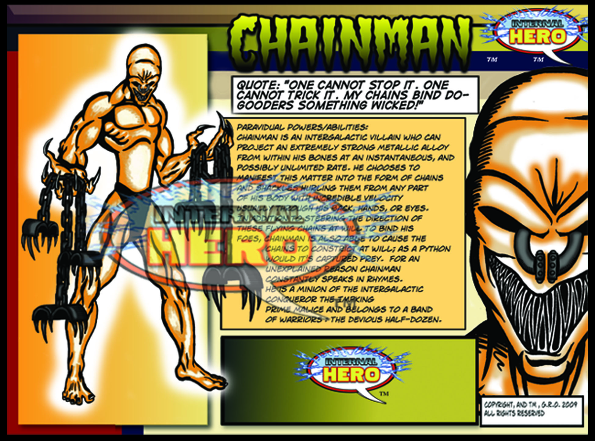 He is a scout who searches possible worlds to conquer. This is his mission as a minion of the Impking Prime Malice. Chainman belongs to a band of warriors called The Devious Half-Dozen.