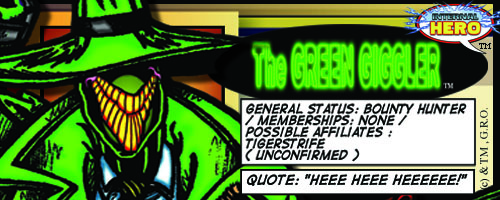 Paravidual abilities: Possessing no extraordinary abilities beyond those of regular people The Green Giggler holds an impressive reputation in the criminal/villain world. Gregory G. Giglesby was a former engineer and weapons designer for private industry manufacturers. Knowing Gregory was holding back his most breakthrough , revolutionary, and advanced ideas from the company he was contracted to design for the governing board hired a mercenary by the name of Tigerstryfe ™ to dispose of Gregory permanently. The governing board suspected Gregory of holding back his most advanced weapons concepts to sell under the table to their competitors. Should Tigerstrife ™ succeed at his mission the governing board would simply steal the ideas and technical specifications for themselves. However ,neither the governing board nor Tigerstrife realized the true reason as to why Gregory held back his best weaponry designs, he was in fact the infamous bounty hunter The Green Giggler. After a seemingly endless battle between cat cunning and technological weaponry both villains decided their conflict was fruitless. The Green Giggler and Tigerstrife struck a bargain, Tigerstrife would ‘deliver’ Gregory’s (unconscious) body while clothed in the Green Giggler’s costume. Tigerstrife would demand a much larger payment for the hazard and difficulty of the job- disposing of the infamous Green Giggler. The governing board agreed to the sum of ten million to compensate Tigerstrife ™ for his supposed efforts, and delivered it, in cash, moments later. Once the governing board delivered the payment, Tigerstrife and the Green Giggler disposed of them all- protecting the identity of the Green Giggler to ongoing secrecy. Splitting the millions 50/50 the Green Giggler and Tigerstrife made an ‘honor pact’ among mercenaries: Tigerstrife would keep the Green Giggler’s identity a secret , and the Green Giggler would never mention- to anyone, that Tigerstrife was not able to defeat him.