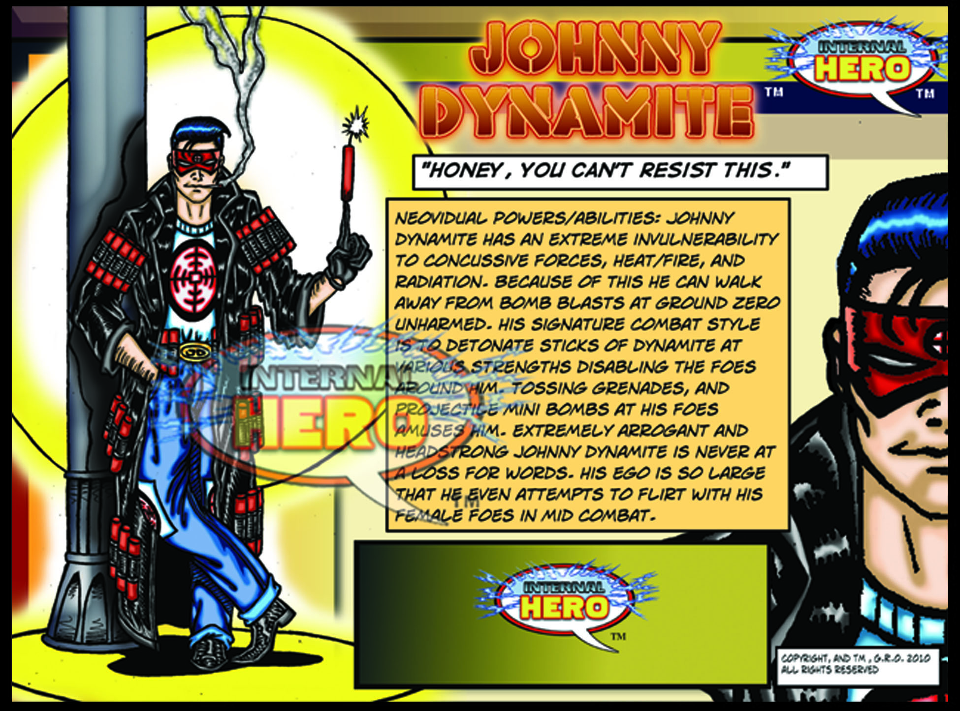 Neovidual Powers/abilities: Johnny Dynamite has an extreme invulnerability to concussive forces, heat/fire, and radiation. Because of this he can walk away from bomb blasts at ground zero unharmed. His signature combat style is to detonate sticks of dynamite at various strengths disabling the foes around him. Tossing grenades, and projectile mini bombs at his foes amuses him. Extremely arrogant and headstrong Johnny Dynamite is never at a loss for words. His ego is so large that he even attempts to flirt with heroine foes in mid combat.
