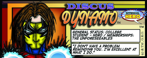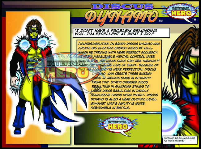 Neovidual powers: Discus Dynamo can create bio electric energy discs at will, which he throws with near perfect accuracy. He has a measurable mental control over the path of the discs once they are thrown as long as they stay within his line of sight. Because of this his accuracy is very near perfection. Discus Dynamo is able to create these energy discs in various sizes and intensity from tiny limited static charged discs resulting in annoying stings to large discs resulting in concussive deadly force upon impact. Discus Dynamo is also an Olympic level gymnast who’s agility is quite formidable in battle.