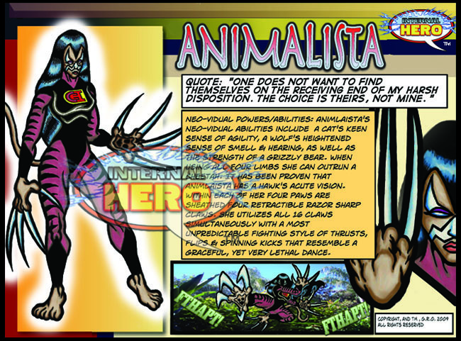 Neovidual Powers/abilities In brief: Animalista possesses a cat's keen sense of agility, a wolf's heightened sense of smell & hearing, as well as the strength of a grizzly bear. When using all four limbs she can outrun a cheetah. It has been proven that Animlaista has a hawk's acute vision. Within each of her four paws are sheathed four retractable razor sharp claws. She utilizes all 16 claws simultaneously with a most unpredictable fighting style of thrusts, flips & spinning kicks that resemble a graceful, yet very lethal dance. She co-leads the Collective of Exceptional Individuals.